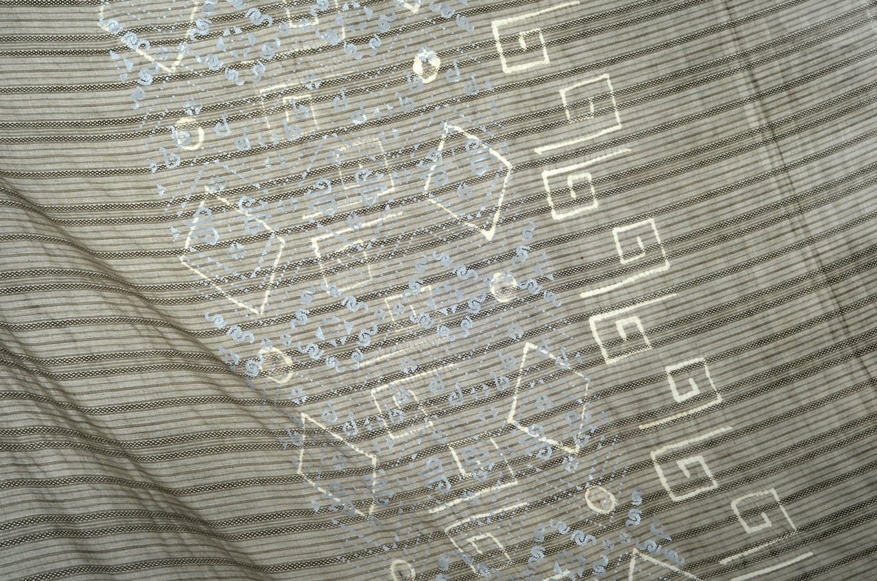 Tenun Lene PaintingTenun Lene Painting terbuat dari katun, rakel, screen dan campuran tinta, menggunakan teknik tenun ATBM, warna alam, tinta dan bubuk logam yang disablonkan pada kain. Tersedia dalam ukuran 200cm x 110cm, bahan ini diwarnai dengan proses alam dan kimia dan dipercantik dengan motif Kakunsi.